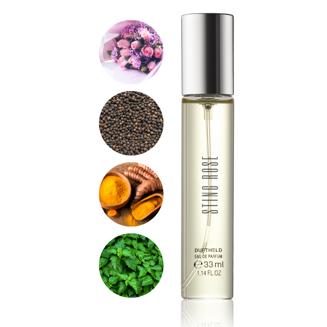 STING ROSE vereint die Eleganz der bulgarischen Rose mit der feinen Schärfe von Szechuanpfeffer und der zarten Mairose. Würzige Akzente von Kurkuma verschmelzen mit der süßen Wärme der gerösteten Tonkabohne. In der Basis sorgen indonesisches Patchouli und Tolubalsam für Tiefe, Sinnlichkeit und eine cremige Abrundung.
